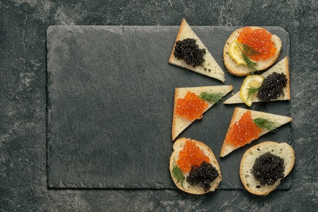 sandwiges with red salmon and black stugeon caviar on a black stone board on a black table, top view with copy space.
