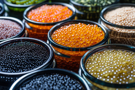 A stunning assortment of gourmet fish roe and caviar, displayed in clear bowls. Perfect for culinary presentations, appetizers, or fine dining experiences.