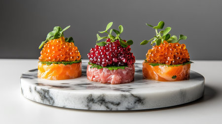 Canap trio with brioche, raw beef tartar, and salmon red caviar, served on a marble platter.