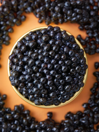 A bowl filled with shiny black tapioca pearls sits at the center of a colorful background. Many more pearls are scattered around, creating a lively food market atmosphere