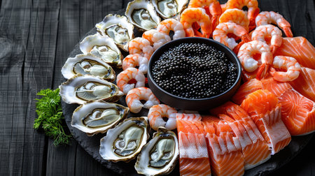Seafood plate: shrimp, salmon, oysters, black caviar in abundance on a black wooden background.