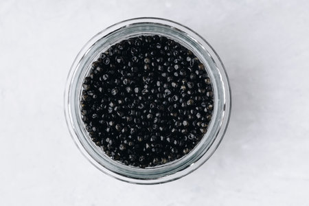 Black caviar in glass jar on white stone background, luxurious delicacy appetizer. Top view, copy space