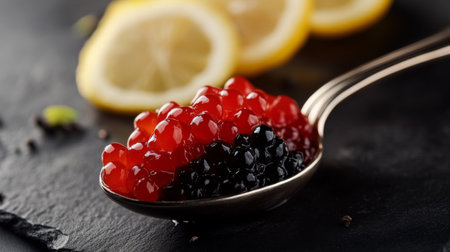 A spoonful of red and black caviar resting on a slate plate, garnished with lemon slices.