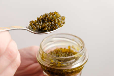 hand of waiter in gloves take a black caviar in spoon. High quality photo