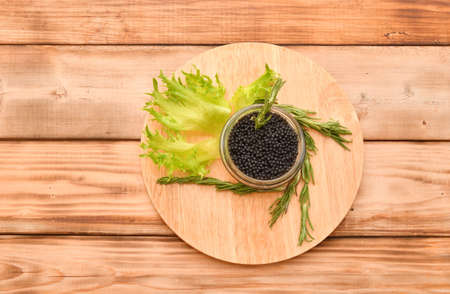 Black fish caviar with rosemary branch on a stone background. Seafood diet.