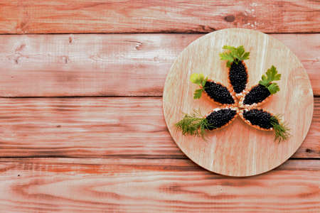 Toasts and Tartlets with Red caviar and butter in wooden tray. Wooden background. Top view. Copy space