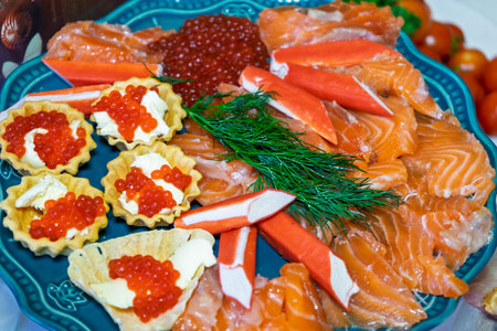 A vibrant seafood platter displays slices of fresh salmon, crab sticks, and caviar-filled pastries.