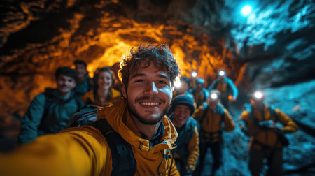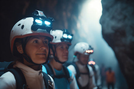Cave explorer walking through a dark cave illuminated by headlamps. Stunning cave decorated with beautiful stalactites and vibrant rock formations. Generative AI
