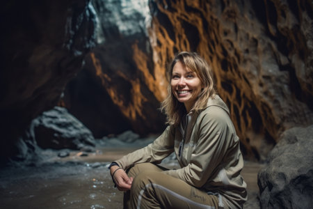 A caver navigates a tight passage in a cave, focused and determined. Wearing a helmet with a headlamp, dirt marks her face, highlighting the challenging exploration of this natural wonder