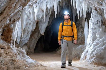 Geologist walking in a cave with stalactites, wearing headlamp and backpack, exploring the underground environment