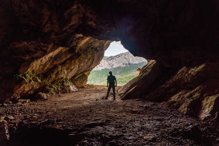 Interior view of man standing at the entrance of the Drachenhoehle (Dragon Cave) in Pernegg an der Mur in Styria, Austria. Cave near mount Rothelstein in Mixnitz in the Grazer Bergland. Grotto, Europe