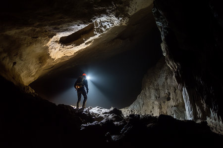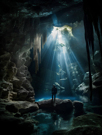 A solitary figure stands illuminated in a dark cavern, delving deep into the secrets of nature waiting to be discovered. Generative AI