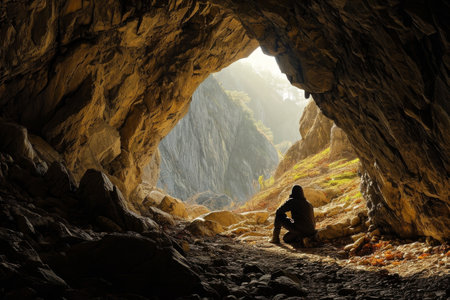 male hiker standing in the entrance to a cave, capturing the essence of atmospheric landscapes. this backlit photograph, shot in 8k with lomography lady grey film, showcases the whimsical wilderness. the uhd image quality brings out the stunning details, making it a high-quality photo. ai generated