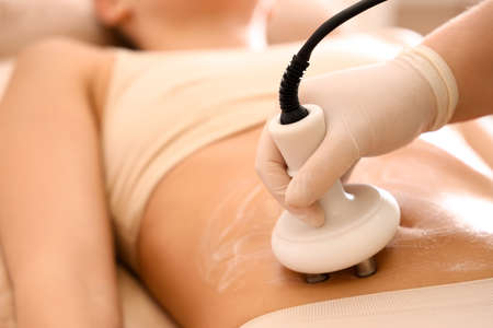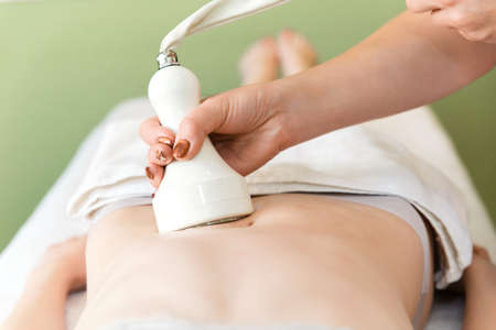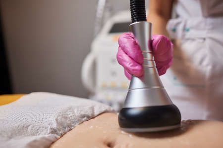 procedure removing cellulite on female abdomen, cavitation belly massage. Ultrasonic massage for weight loss. Correction of female figure without surgical intervention. Closeup of the tummy.