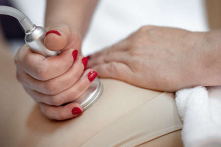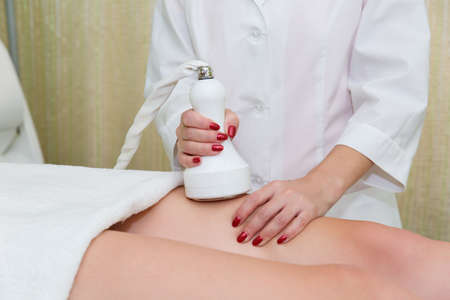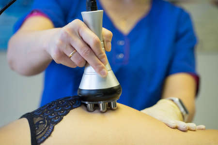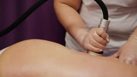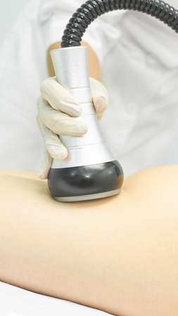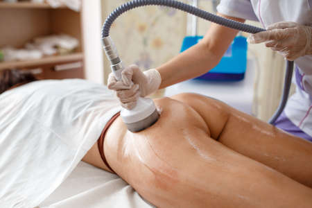 Anti-cellulite procedure on the hips in the spa. Close-up of the apparatus massages the problem area. Ultrasonic cavitation body contouring.