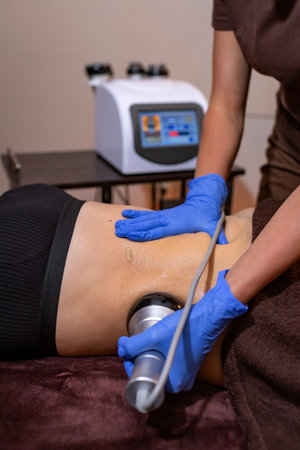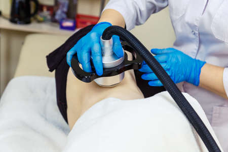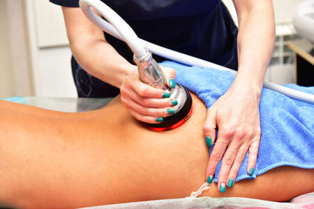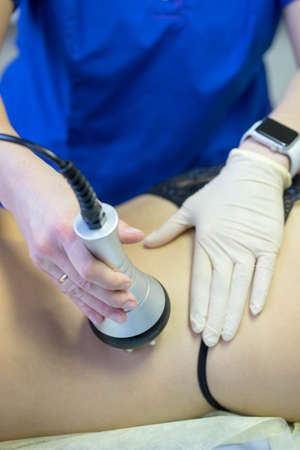 cavitation of the abdomen by a cosmetologist. The nozzle touches the skin
