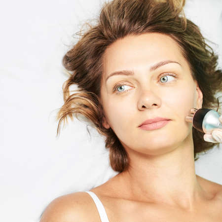 Shot of cosmetologist makes the procedure an ultrasonic cleaning of skin of a beautiful young woman on the spa center.