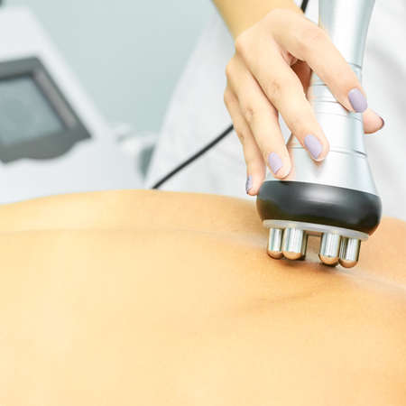 Hardware cosmetology, ultrasonic body cavitation, a woman receives anti-cellulite and anti-fat therapy in a beauty salon.