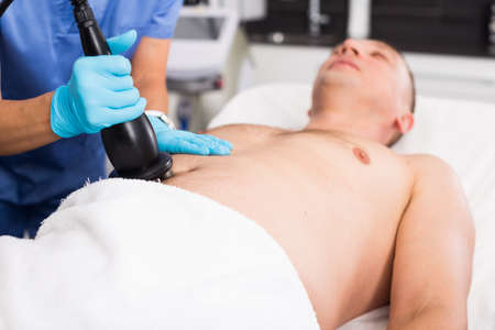 Laser hair removal on mans belly. Doctor and patient in clinic.