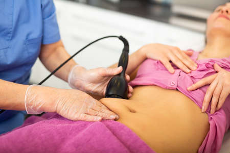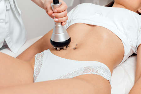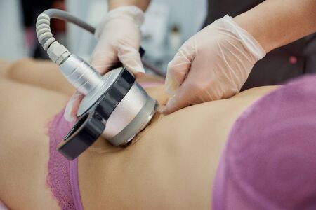 procedure removing cellulite on female abdomen, cavitation belly massage. Ultrasonic massage for weight loss. Correction of female figure without surgical intervention. Closeup of the tummy