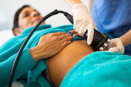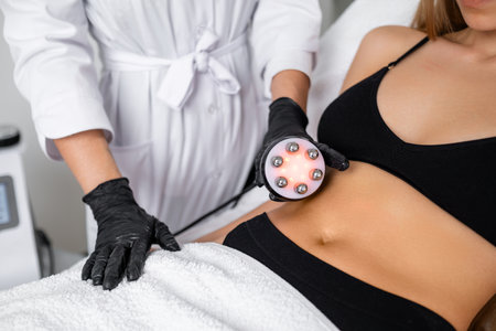 Belly fat reduction is the focus as a young woman undergoes RF body cavitation lifting at the beauty salon.