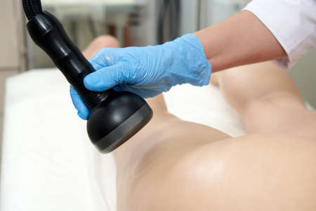 Woman in a beauty salon. Ultrasonic massage of the female buttocks and hips against cellulite and excess weight. Hardware figure correction. The doctor conducts the cavitation procedure for the girl.