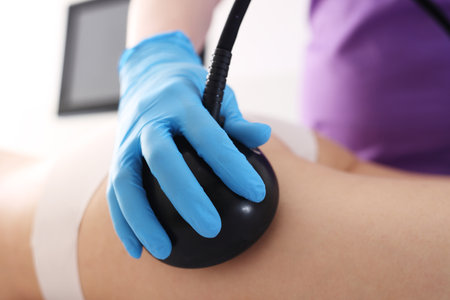 professional cosmetologist using ultrasound cavitation machine on a female buttock