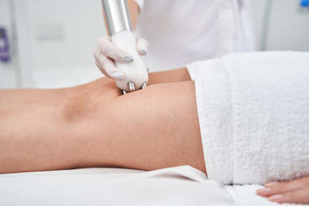 Skin and body care. Woman receives an electric massage against cellulite. Close-up of the apparatus massages legs of woman.