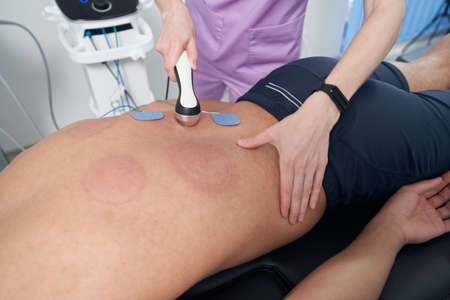 Woman doctor is doing vacuum massage procedure on belly of adult client