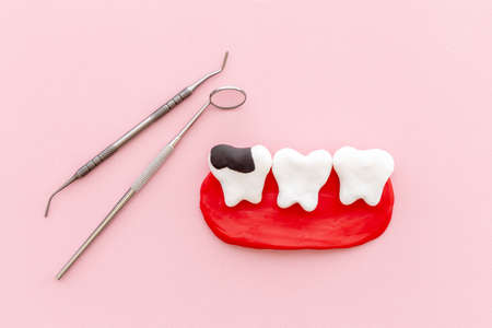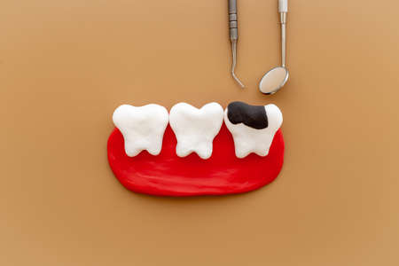 Teeth models with caries or plaque and dentist tools