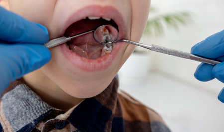 A dentist examines a child's tooth cavities using a mirror and probe. Tooth decay.