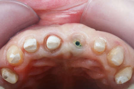 photo story about a boy of six years who had his first baby tooth. macro shot of lower jaw, gums, teeth