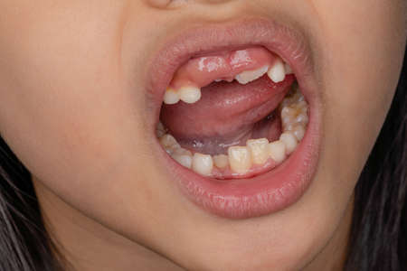 close-up mouth of a five-year-old Caucasian girl with a stagger baby tooth, front tooth tilted forward on the lip