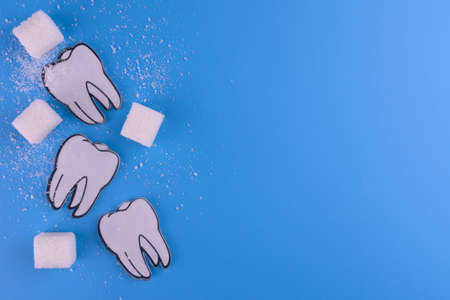 Teeth and sugar cubes on a blue background. The concept of destruction of tooth enamel by sugar. Caries. Copy space.