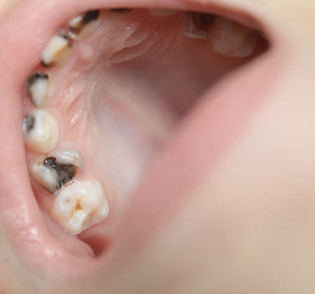 Teeth with caries and pulpous teeth in the mouth of a female patient. Dental treatment in dentistry