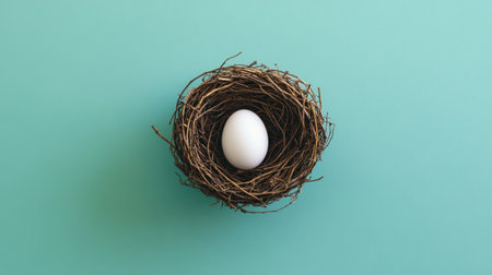 A flat lay of a twig nest holding a single white egg on a plain, soft pastel background.