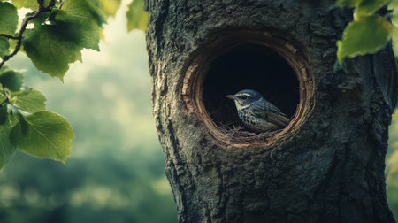 A small bird perches at the entrance of its nest inside a tree trunk. Vibrant green leaves frame the nest, illuminated by gentle morning sunlight, creating a serene environment.