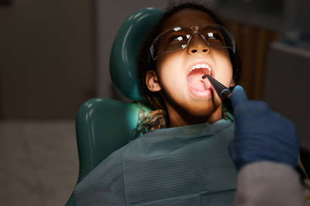 Closeup photo shoot of process of dental operation over small boy by expirienced dentist.