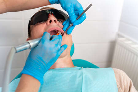 Dentist uses photopolymer lamp to cure carious teeth of the patient