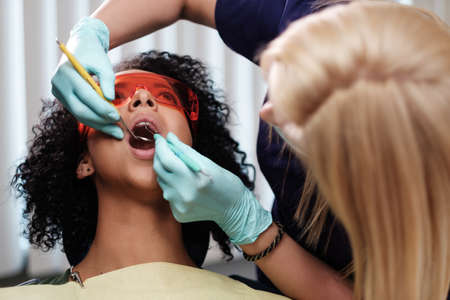 doctor dentist doing medical stomatology examination for woman patient, using professional tools