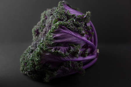 Green cabbage close-up isolated on black background. Dark food photography. Side view