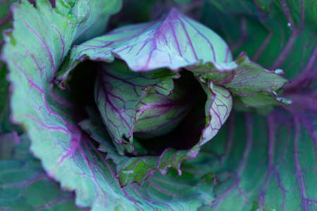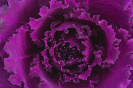 Ornamental colored purplecabbage covered with dew drops or rain. Abstract floral background. selective focus. Various Acephala or Brassica oleracea. Toning in color Very Peri.