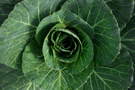 Gardening and agriculture concept. Green leaves of young cabbage, top view. Natural background