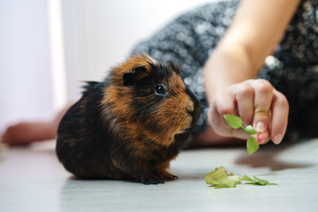Adorable guinea pig interacting with its owner while enjoying fresh greens in a cozy indoor setting