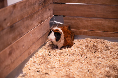 A small guinea pig is curiously exploring its wooden enclosure filled with soft bedding. The cozy indoor setting provides a nurturing environment for this little pet.
