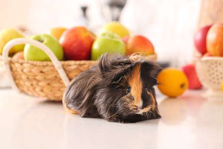 Cute guinea pig with apples on kitchen table