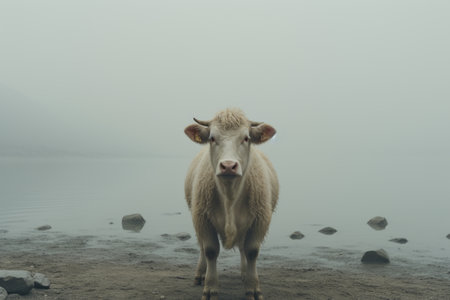 A captivating close-up of a curious cow standing in focus with a herd of cattle in the background, set against a misty, winter landscape.