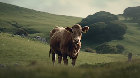 Brown cow on a hillside, isolated on a white background.