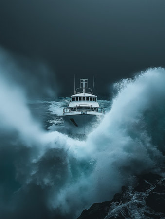 A tugboat battles against colossal waves in a dramatic maritime scene, showcasing the power of nature and the resilience of sea vessels during stormy conditions.