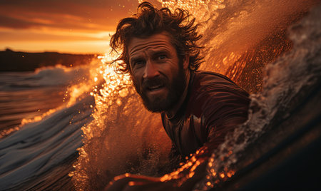Adventurous surfer embraces the thrill of riding ocean waves in trendy attire. Concept Surfing, Ocean waves, Adventurous, Thrill, Trendy atmosphere